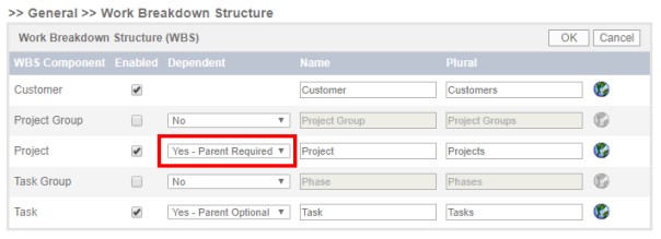 Dependencies allow you to limit or scope which items can be added to a timesheet based on a previous selection in the WBS structure. For instance, you might want to limit some projects to specific customers. To do this you would select the appropriate "Dependent" selection from the Dependent menu: