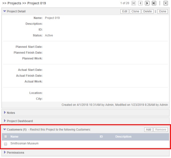 Selecting "Yes" indicates that a project depends on the parent component above it, in this case the customer. Now when you view the properties for a project (from the Tasks > Projects page) you will see a Customers section: